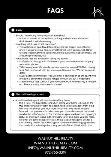Walnut Hill Realty does everything a traditional real estate agent does at a fraction of the cost. Sell your house with Walnut Hill Realty for ONLY $5000 at closing.